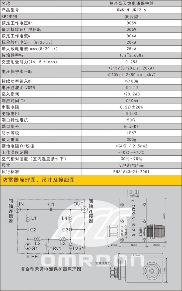 歐姆雷盾(OMRDON)1.2-2.6G天饋電涌保護(hù)器(SPD、防雷器)是專門為GPS/BD通訊基站通信頻段收發(fā)系統(tǒng)設(shè)計(jì),使其免遭由天饋線引入的感應(yīng)雷擊及靜電放電等過電壓損壞。本產(chǎn)品具有防水、防塵功能,可用于室外安裝場(chǎng)所。