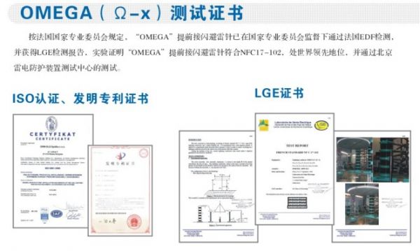 OMEGA:Ω-X提前放電避雷針由法國PIORTEH & WRWELS集團公司研制,公司已取得ISO9001認證,持有INERIS(法國環保直屬機構)證書,公司產品銷住世界30多個國家和地區,廣泛用于建筑物、航空、和石化企業,如:巴黎榮軍院(拿破侖墓)、先賢祠、戴高爾機場、波蘭哥白尼紀念館、世界最高的法國米約大橋、波蘭大教等名建筑中均有使用。產品已通過EDF、LGE、北京雷電防護裝置測試中心的檢測報告和中國發明專利,產品由太平洋保險公司承保。