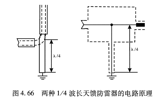 ① 1/4波長天饋防雷器:這是利用射頻信號頻譜與雷電流能最頻譜之間的差異,在天饋線上并接1/4波長的短路支線來泄放雷電流的防雷器,如圖4.66所示。支線與天饋線的交點A,對于射頻信號說來呈開路狀態,這樣就保證了天饋線上射頻信號正常傳輸。如果按照8/20μs波形、20kA雷電流峰值來計算,進入收發設備的殘余能量Eg應為: