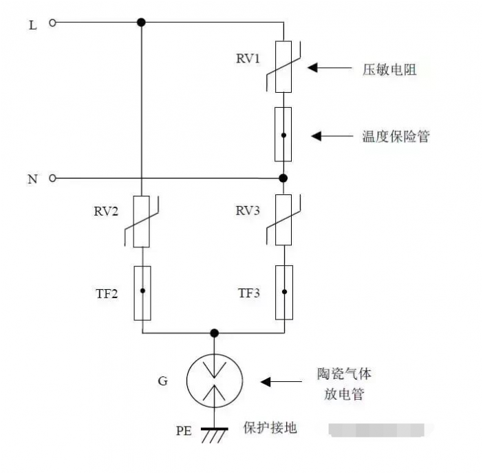 缺點:壓敏電阻RV1短路失效后易引起火災。最好在每個壓敏電阻上串聯一個工頻保險絲以防壓敏電阻短路起火。如果L、N線不可能接反,則可省去壓敏電阻RV2、RV3,將放電管G的上端直接接到N線上,構成“1+1”電路。