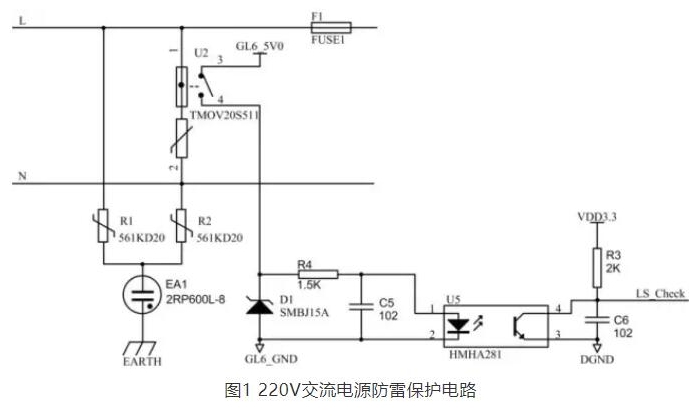本電路由于采用了金屬氧化鋅壓敏電阻U2,因此能有效地避免傳統的氧化鋅壓敏電阻因短路失效可能帶來的火災等安全隱患。與此同時,如果因為雷擊損壞時,其隔離的熔斷保險絲將同時熔斷,主機CPU可以在LS_Check端檢測到相應的信號,從而起到雷擊損壞報警功能。