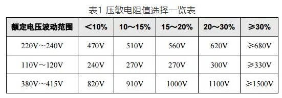 壓敏電阻的壓敏電壓值可參考表1選取,壓敏電壓值可以適當選高一點,這樣更安全、耐用,故障率低,但殘壓略高。然后根據通流容量要求選擇外形尺寸和封裝形式,或采用幾個壓敏電阻并聯,注意應挑選壓敏電壓值相近的并聯,每個壓敏電阻都要單獨串聯溫度保險管,以延長使用壽命和確保安全。